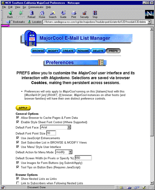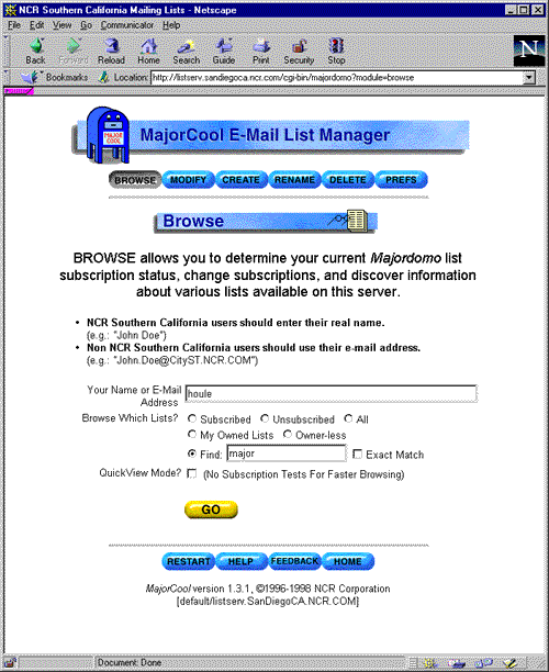 BROWSE mode is the act of viewing list information and/or changing subscription status to the lists served by Majordomo. In order for the browsing process to begin, the user is first queried for his/her e-mail address. The user also has the option at this time to limit the browsing to: