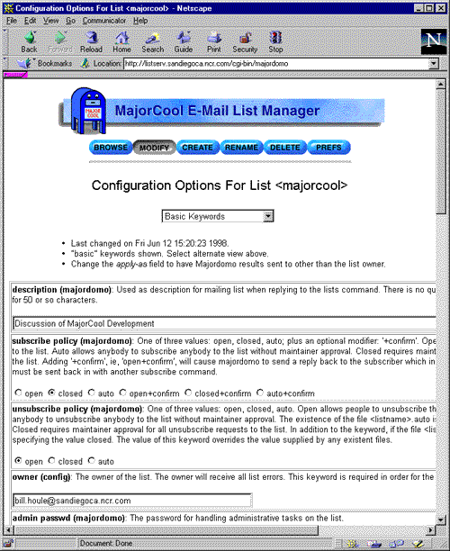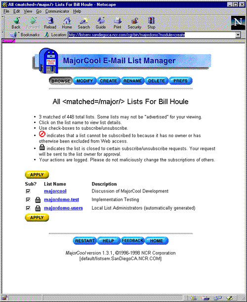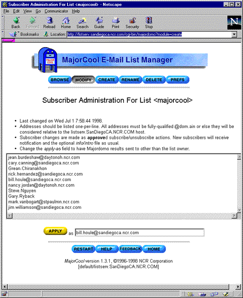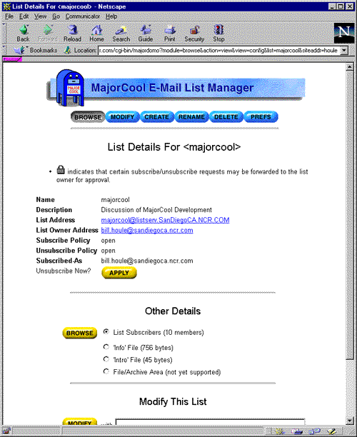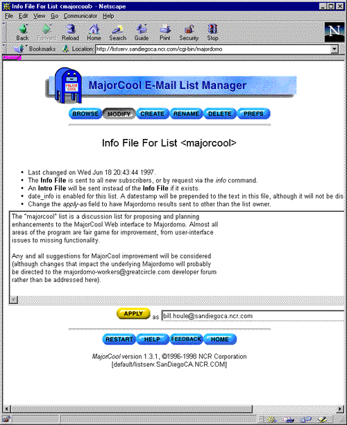 MajorCool is a Web interface to the Majordomo mailing list management tool. Whereas Majordomo is a rather unforgiving command-driven application that utilizes e-mail for effecting changes, MajorCool adds a Web-based front-end to provide a user-friendly interface to list manager operations.