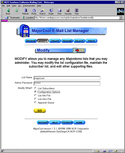 The MODIFY module provides access to the list-manager functions for a selected list. The user is prompted for a list name (via typed entry or pull-down menu) and the list password. The list administrator has the option of choosing to modify the: