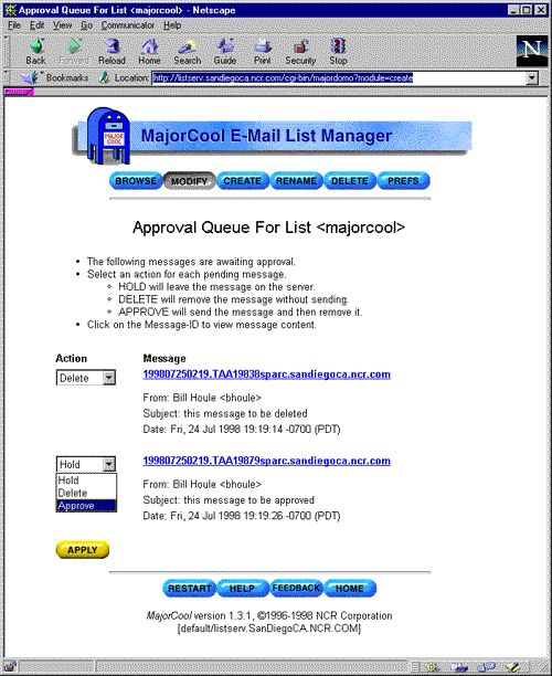 If the installed version of Majordomo supports it, MajorCool will also provide an APPROVAL QUEUE option. The "approval queue" is where Majordomo stores messages that were sent to the list but require moderator approval before posting (e.g. moderated lists, administrivia checks, etc).